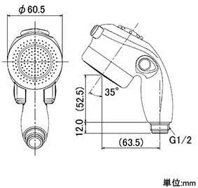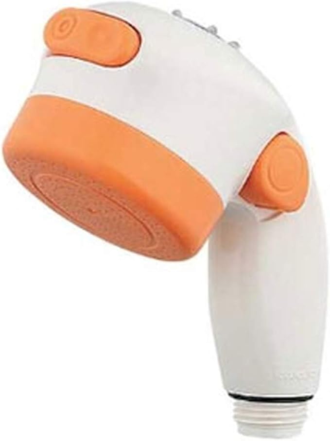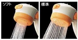 手元のレバーでシャワーの流量が、ボタンで吐水幅の調節ができるシャワーヘッド。