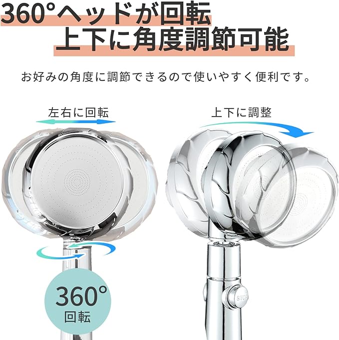 ✅【角度調整機能】角度調整が自由自在なヘッド機能。シャワーヘッドが360度ヘッド回転、上下に角度調整もできるためストレスなくシャワーが使えます。