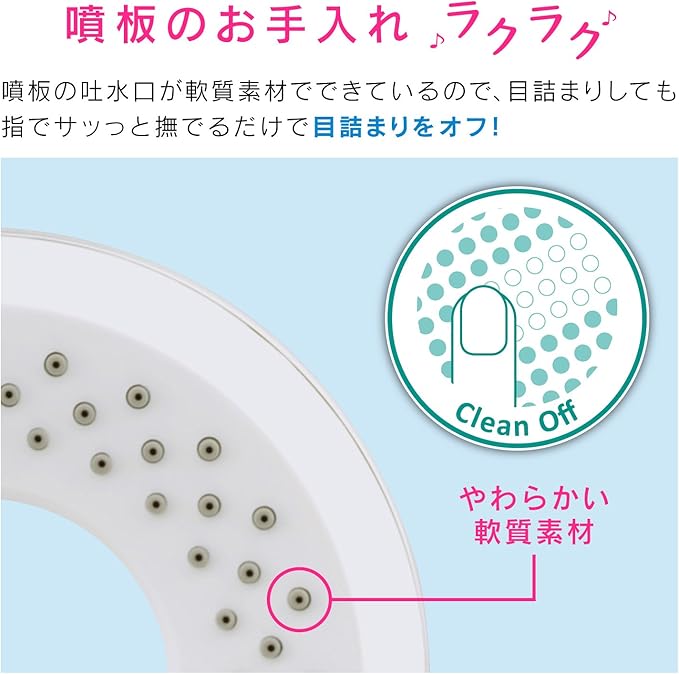 ・軟質噴板採用により、噴板の突起を指でなぞるだけで目詰まりなどのお手入れが楽々