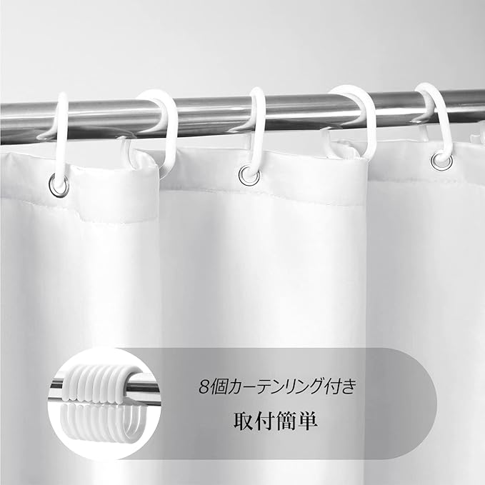 【サイズ】幅120cm 丈150cm 素材:100%ポリエステル 仕様:防水防カビ パッケージ内容:本体*1+カーテンリング*8 カラー:ホワイト 無地