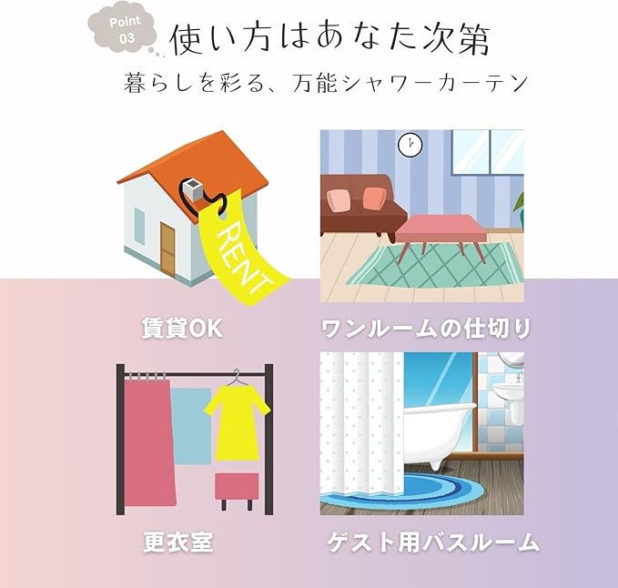 シャワーカーテンとしてはもちろん、部屋の仕切りや更衣室、棚の目隠しにも最適。軽度防水加工で水はねを防ぎ、浴室の湿気も遮断。賃貸物件やゲストハウスでも便利に使えます。