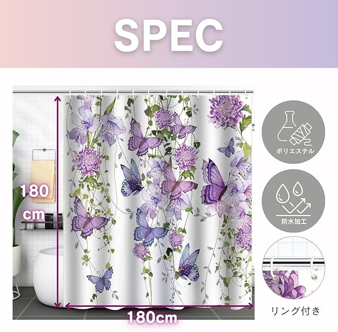 美しい紫の花と蝶が舞うデザインで、浴室を華やかに彩るシャワーカーテン。丈180cmでユニットバスにぴったり。目隠しや仕切りとしても活躍し、空間を明るくおしゃれに演出します。