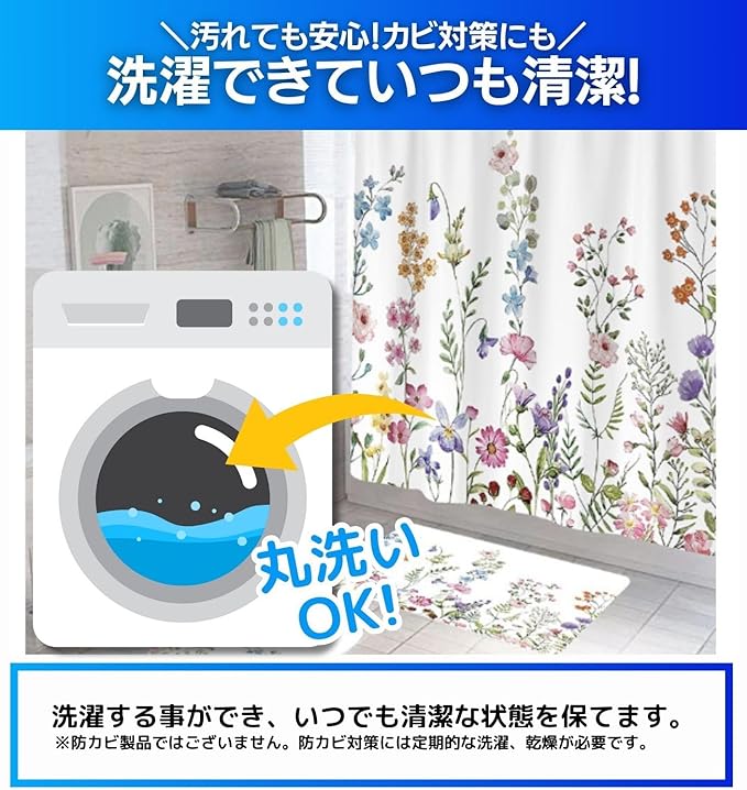 【軽度防水&お手入れ簡単】軽度防水機能付きで、水の飛び散りを防ぐとともに、浴室の湿気を部分的に遮断し、清潔な環境を保ちます。丈夫なポリエステル素材で耐久性も抜群。カーテンリング付きで取り付けも簡単です。洗濯可能なため、汚れてもお手入れが簡単で長期間使用できます。おしゃれで機能的なシャワーカーテンは、家庭用としてだけでなく、賃貸物件やゲストハウスでも重宝します。