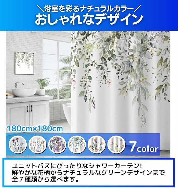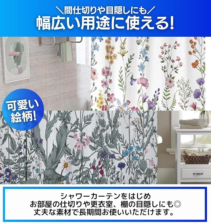 【おしゃれなデザイン】鮮やかな花柄からナチュラルなグリーンデザインまで、全5種類から選べるシャワーカーテン。ユニットバスにぴったりの180cm丈で、目隠しや仕切りとしても最適です。様々なインテリアにマッチしておしゃれなバスルーム空間を演出し、浴室を明るく彩ります。また、シャワーカーテンとしてだけでなく、部屋の仕切りや更衣室、棚の目隠しにもお使いいただけます。