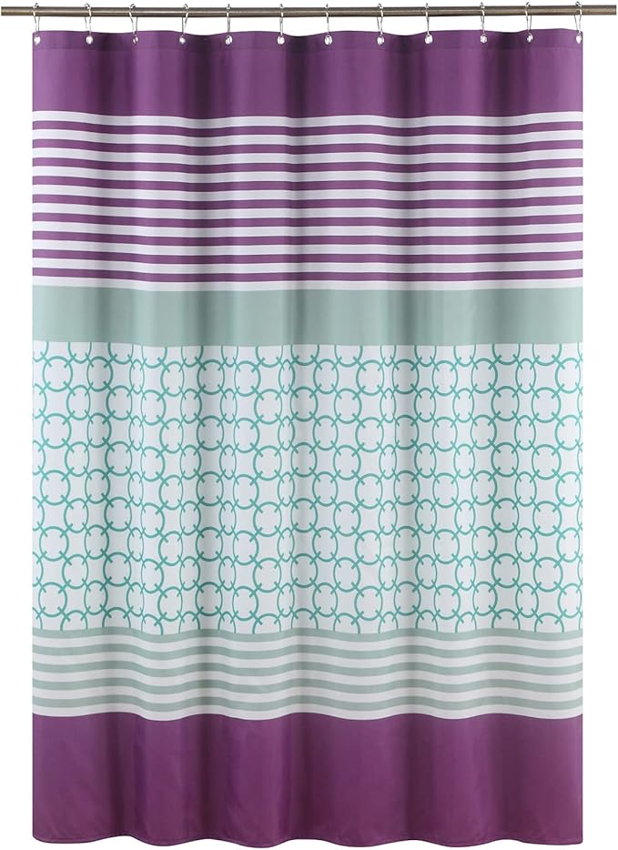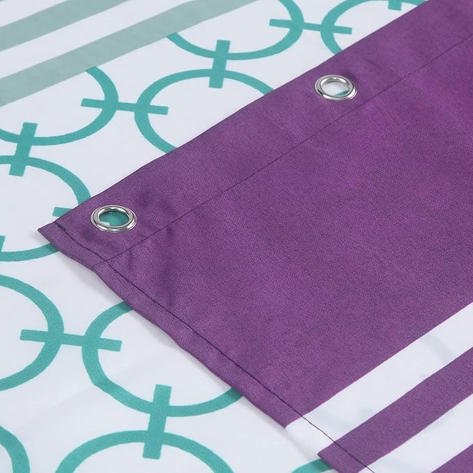 このカーテンはあなたの浴室のために青春と活力を持ってくるの特徴は、青绿色と白の格子の模様と水平な银と紫のストライプのこの风吕のカーテンは100%ポリエステルの生地の完全なプリントの设计の美しい色とあなたの今ある装饰の组み合わせと融合することができます