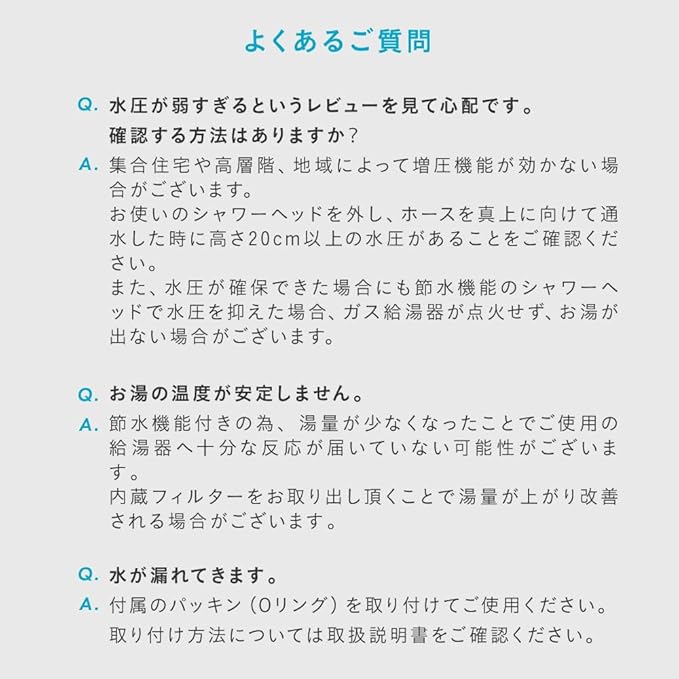 ✅お客様より水圧、水漏れに関するお問い合わせをいただき、水圧と水漏れ対策において品質改良を実施しまして、現在販売中の商品では問題を解消しております。万が一何か不備がございましたら、お気軽にお問い合わせください。