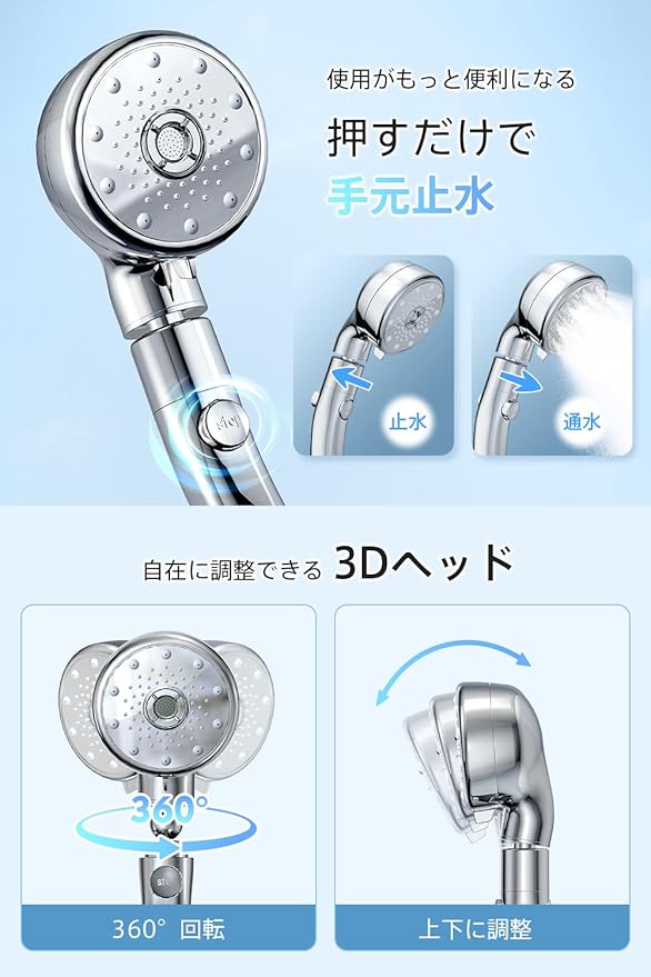 【ワンタッチストップ&水量調節で、節水・節電・節約を実現】「STOP」ボタン一つで水を瞬時に止められる手元ストップ機能で、洗髪中や子供・ペットの入浴時にも無駄な流水を防ぎます。水量も手元で簡単調整可能。蛇口の開閉が不要なため、長期的には水道代・ガス代・電気代の削減にもつながります。※一時停止専用のため、長時間のストップはご注意ください。