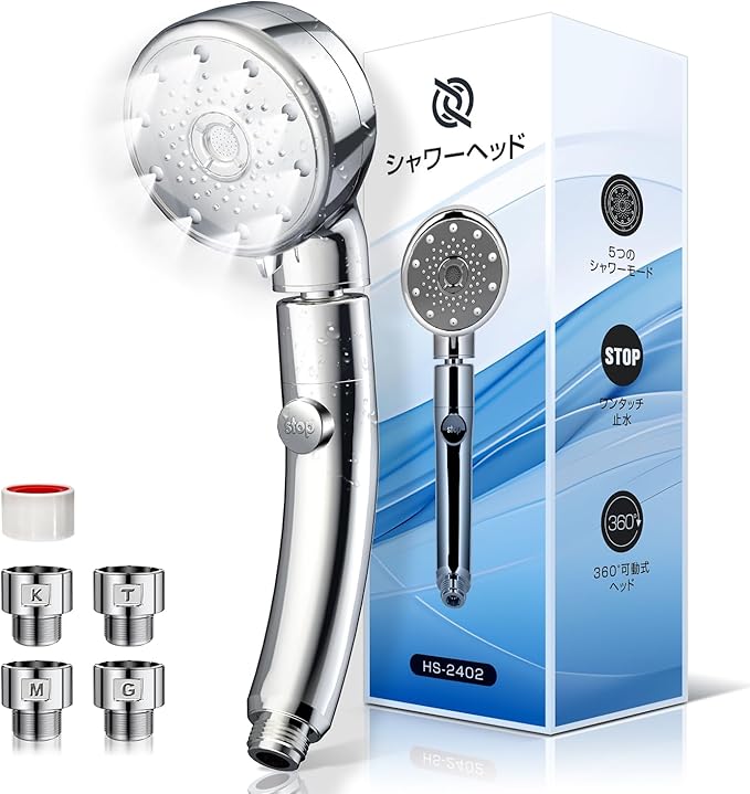 【 簡単取り付け&多種アダプター付きで、ほぼ全てのシャワーに対応】国際標準サイズG1/2インターフェース採用で、工具不要・手軽に取り付け可能。K/M/G/Tの4種類のアダプター付きで、ほぼ全てのメーカーシャワーに対応。初心者でも安心して設置でき、すぐに快適なシャワーを楽しめます。付属品:シャワーヘッド本体 1、ゴムリング 4、パッキン 4、アダプター 4、シールテープ 1、取扱説明書 1。