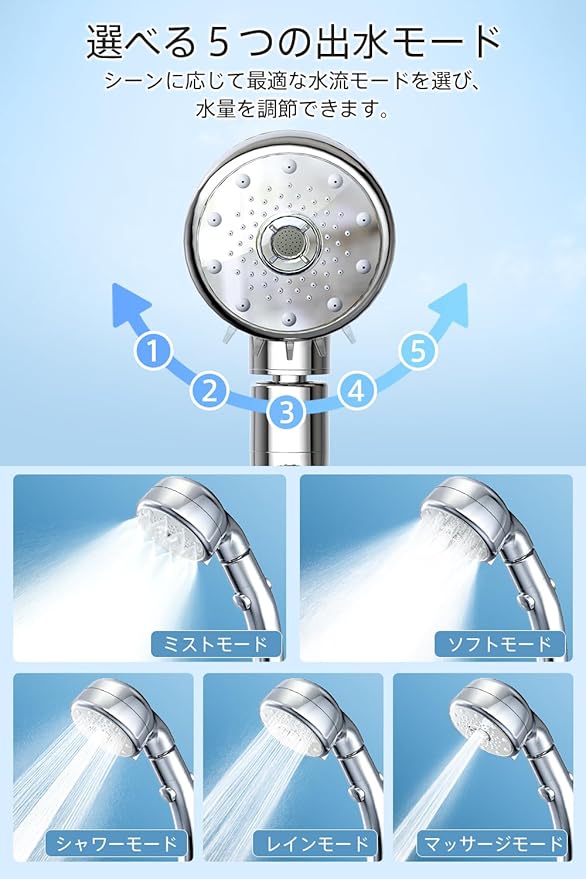 【5つの水流モード&360 回転ヘッドで、部位別最適洗浄を実現】「全身洗い」「レインシャワー」「ミスト洗顔」など、用途に合わせて5つの水流モードを簡単に切り替え可能。上下60 ・左右360 の自由角度調節ヘッドで、背中や首元、赤ちゃんやペットの入浴サポートにも便利。体のラインに沿って最適な角度で洗えるため、毎日のシャワータイムがより快適に。
