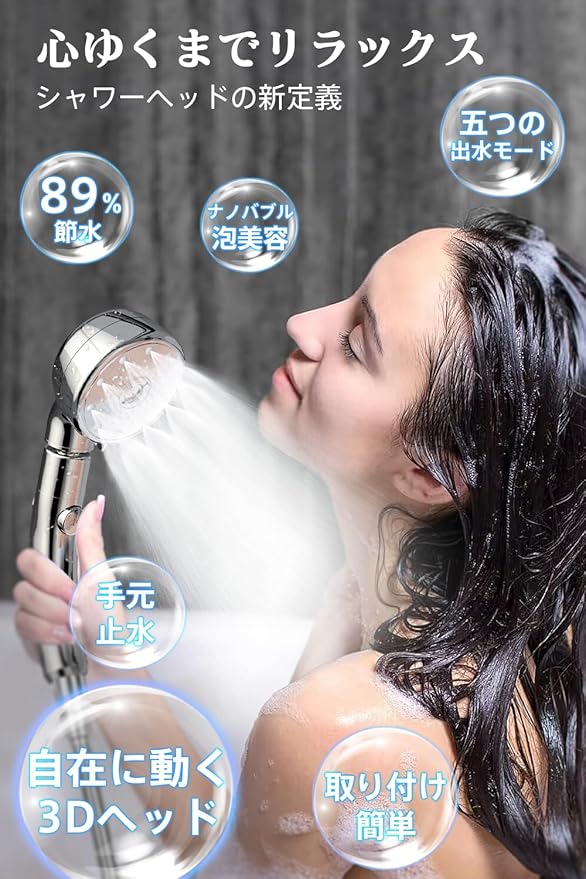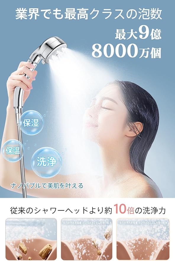 【 業界トップクラスのマイクロナノバブル&極細水流で、肌と頭皮の奥まで汚れをしっかり落とす】約9億8000万個の超微細なマイクロナノバブル(1μm未満)が毛穴や角質の奥深くまで浸透し、通常の水では落としきれない汚れや皮脂を徹底除去。メイク残しが気になる方や敏感肌の方にも◎。また、極細穴散水板により、水圧が低い環境でも細密で快適な水流を実現。顔やデリケートゾーンにも優しい、刺激が約半分のミストシャワーで、肌への負担を最小限に抑えます。