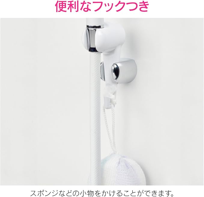 ブラシやスポンジなどの小物が掛けられるフック付きです。