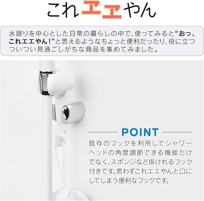 既存のシャワーフックにそのまま取付できる、角度調節機能付きのシャワーフックです。