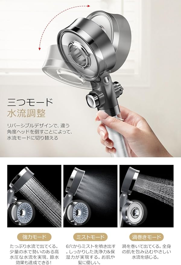 【心地よいの3段階モード★便利的手元止水機能】手持ち式シャワーは、水圧のヘッド部分を簡単に押し倒すだけで、強力モード、渦巻きモード、ミストモードの3種類のモードを自由に切り替えることができます。どんな水圧状況でも快適なシャワーをお楽しみいただけます。また、手元止水ボタンが付いており、簡単にシャワーをストップでき、節水効果もアップです。