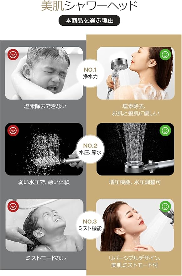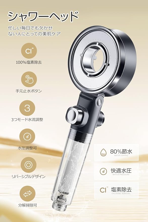 【驚きの強力増圧★魔法のような残留塩素除去】多くの方がお悩みの、団地やアパートの上層階での低水圧問題を解決です!当社の浄水シャワーヘッドは、散水板の出水穴を多数・細かく設計することで、水圧を増圧してたくさんの水を出すことができます。また、亜硫酸カルシウムなどの浄水材を使用した専用フィルターが付属しており、水中の残留塩素や水道の老朽化による不純物をろ過し、美髪や肌ケアに役立ちます。