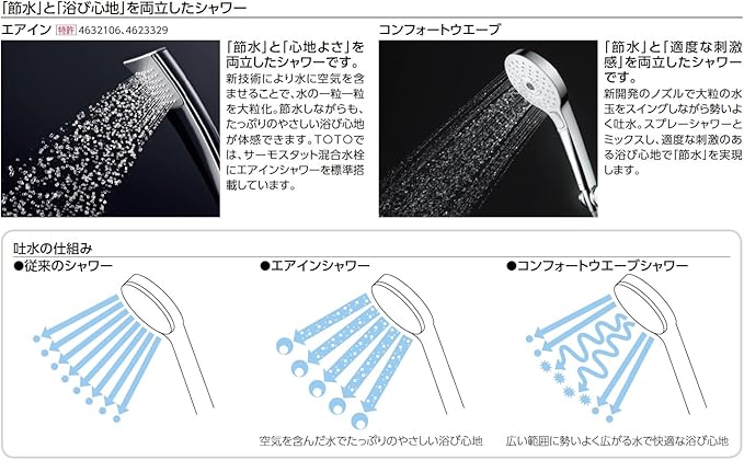 節水と適度な刺激感を両立した新しいシャワーヘッドです。手元のボタンで3つのモードが切替可能