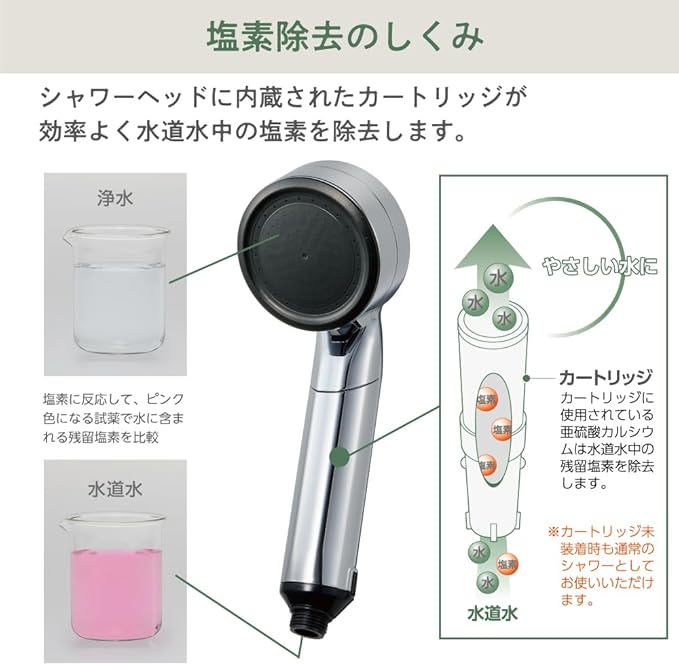【残留塩素除去】髪のキューティクルを剥がし、肌のバリア機能を傷つけてしまう残留塩素。suinの浄水機能であなた本来の髪質を取り戻し、肌のバリア機能を整えます。※カートリッジは1人世帯で約2か月が交換目安となります。