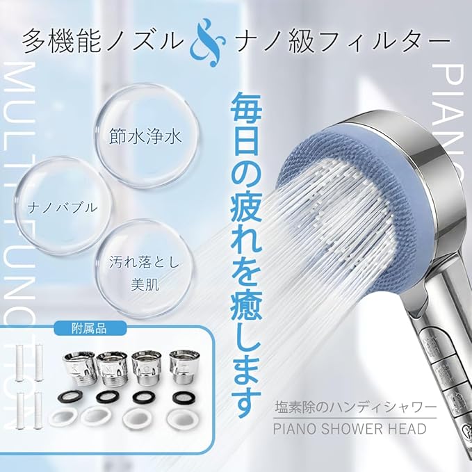 【水質浄化】健康な肌や髪を保つために、シャワーの水質管理は重要な要素です。4本のフィルターをシャワーヘッドに取り付けることで、水道水の不純物を取り除き、水を浄化し、肌や髪への負担を軽減します。