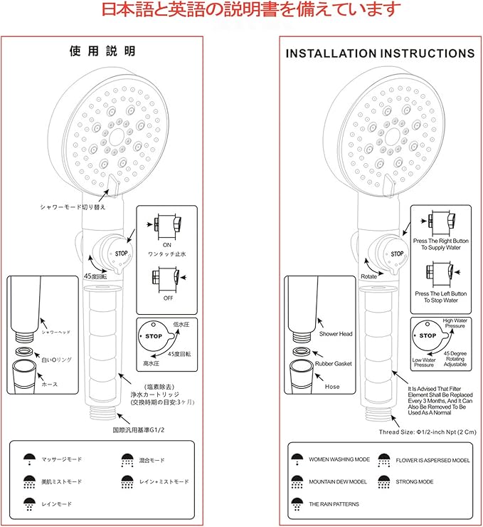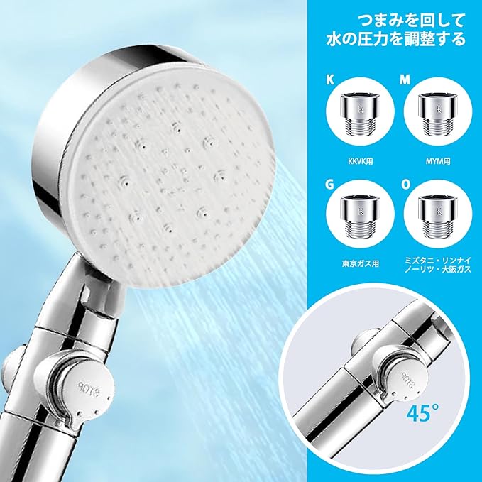 【取付け、分解すること容易】ほとんどの家のシャワーに取付けることができる国際的な共通の標準G 1/2インターフェイスの普遍的な設計を採用します。ツールは必要ありません。非常にシンプルです。最初のインストールでも、それほど時間はかかりません。製品には、ほとんどの設置ニーズに適した4つのアダプター(K/M/G/O)が含まれています。インストールは、製品に含まれる指示に従って行うことができます。シャワーは取り外し可能で、掃除が簡単です