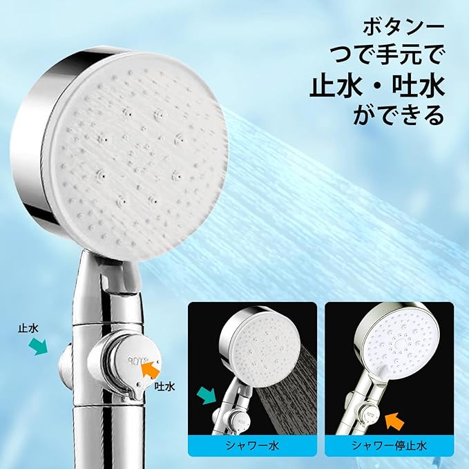 【手元ストップ機能&調整可能な水圧】シャワーハンドルのボタンを押すだけで、ワンクリックで水を止めることができます。操作は簡単で便利です。必要に応じてオンとオフを切り替えることができます。シャワーハンドルのSTOPボタンを回転させ、水圧を自由に調整し、水の流れを合理的に制御することができます。節水を達成して下さい。よりよく節水を達成し、設計は環境保護の概念に合致します
