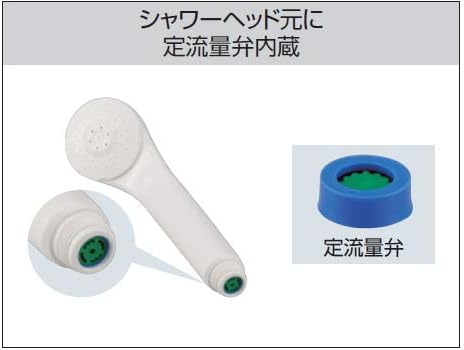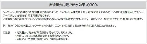 ●定量止水弁付シャワーヘッド●定量止水弁内蔵●全開吐水時でも毎分約7ℓ以下に吐水を抑えますので約30%の節水効果があります。(従来型の毎分10ℓシャワーに対し)●他社対応アタッチメント付