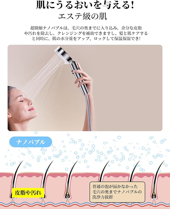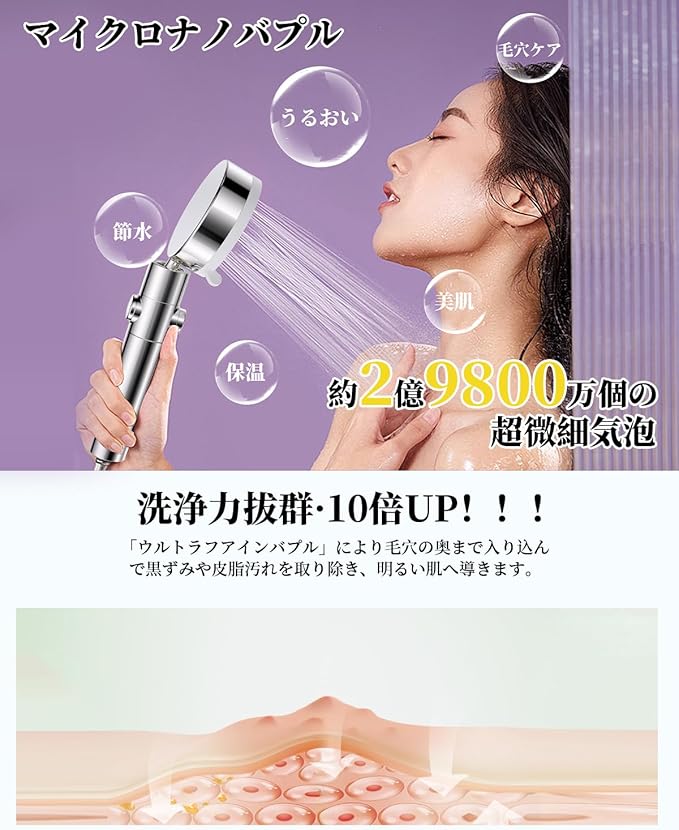 【マイクロナノバブル&高洗浄力】バブル数最大で4億9800万個に達して水を超微細な泡に変えられて、通常の水よりも優れた洗浄力で、肌の毛穴の汚れや化粧品などを効果的に取り除き、つややかな肌を実現できます。 水流モード調整方法:側のスイッチで水流の穴、水流量をコントロールでき、レインモード、マッサ一ジモ一、ミストモード、水流モードなどを実現できます。