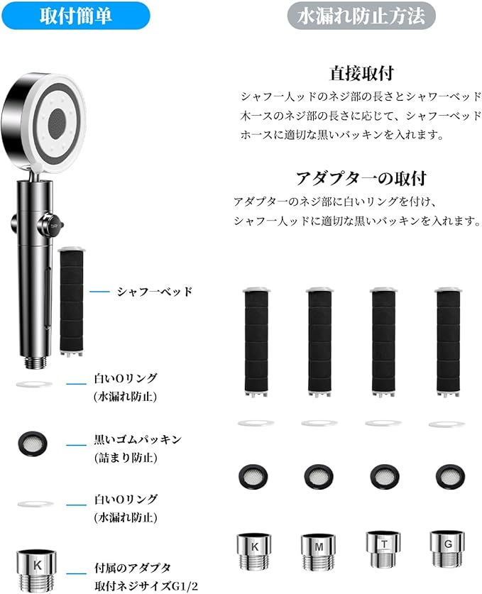 【取り付け簡単&アフターサービス&パッケージ内容】工具不要なのでとっても簡単。初めてインストールする場合でも、そんな時間がかかりません。 パッケージList:シャワーヘッド本体 1台、M/K/G/T4種類のジョイント付き、日本語説明書*1。