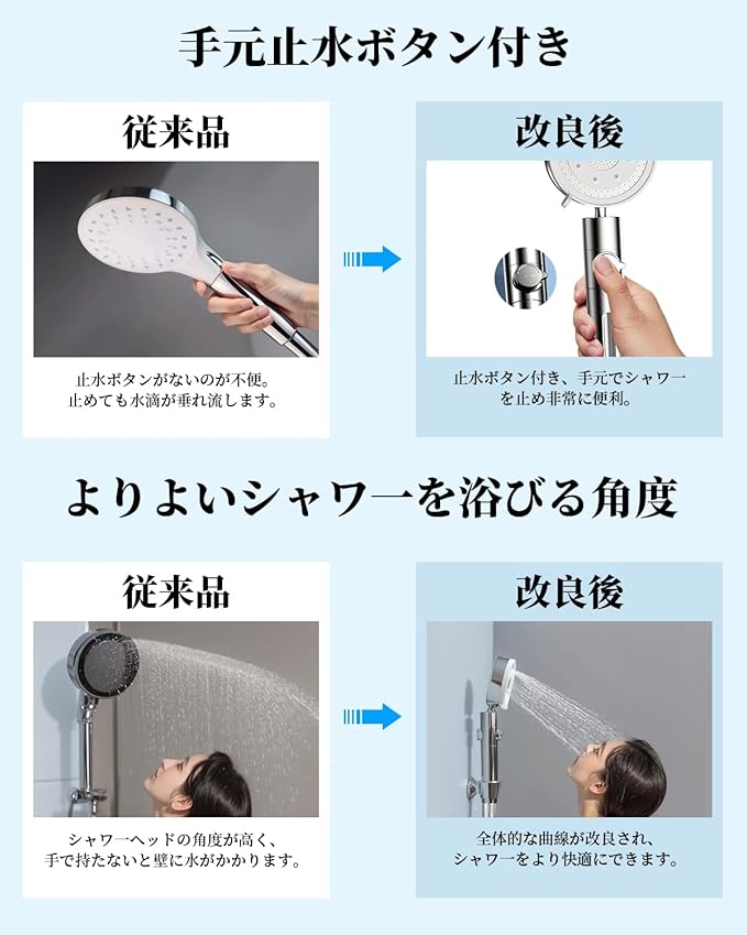 【手元ストップ機能&水量調節機能】ボタンを押すだけでワンキーストップが実現し、オン・オフ切り替えがしやすいなのでとても便利です。特に給湯器のスイッチが高すぎると、洗髪ときに見えないで、子供やペットをお風呂に入れるや頭や体を洗っている最中に、水を流したままでは無駄に水を使うこともなどの場合に操作する事が便利です。「STOP」ボタンで、自分のニーズに応じて適時に水量を回転で調整できます。手元一押止水と水量調整機能の両方で、蛇口の開閉が必要なくワンタッチで水を止められるため、長期的な水道代の削減に効果的です。⚠️ご注意:お手元ストップ機能は、一時的な止水にのみ使用してください。
