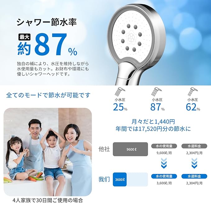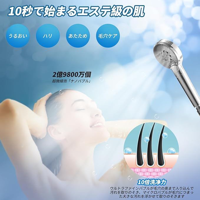 内蔵発生器によって高密度のナノマイクロバブルを高圧システムなしで生成できます。私たちはファインバブル産業の研究開発のリーダーの一つであり、2015年からナノバブル技術に取り組んできました。このシャワーヘッドは、2020年3月および2021年6月に第三者の水質分析室によって認定された、1ccあたり2億9800万個のナノバブルを生成することができます。ナノ/マイクロバブル技術 強力な洗浄力:ウルトラファインバブルが毛穴の奥に浸透し、マイクロバブルが大きな汚れを浮かせて取り除きます しっとりな肌:お湯が角層まで浸透し、肌にハリと潤いを与えます 心地よい温浴:シャワーヘッドを浴槽に入れると、なめらかな肌ざわりのシルキーバスを楽しめます。2つの泡が心も身体も温めます 保証期間:購入日から1年間