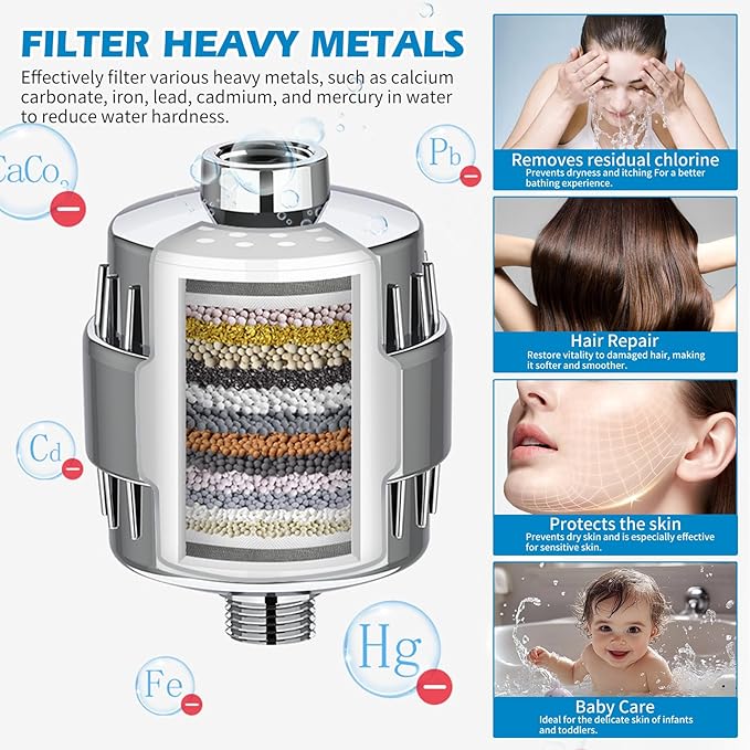 20段階の高性能フィルター構造:KDF55・活性炭・硫酸カルシウム・アルカリセラミックボールなどを含む20層構造により、塩素・重金属・異臭などを効果的に除去。毎日のシャワーをより清潔で快適に。