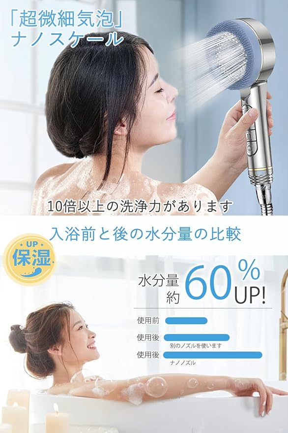 【超微細ナノバブル&洗浄力抜群】Innodenki シャワーヘッドは、6つの噴霧穴を備えたシャワーヘッド。先進的なナノ技術を採用しており、水分子を毛穴より小さい直径0.001~0.1mmの超微細泡とマイクロ泡に変換し、毛穴や肌の奥深くまで浸透。通常の水よりも優れた洗浄力で、メイクや皮脂汚れをスッキリ落とし、つややかな肌を実現します。使用するたびに、シャワーがもたらす清潔感と快適さを実感できます。