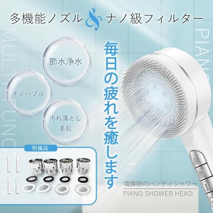 【水質浄化】健康な肌や髪を保つために、シャワーの水質管理は重要な要素です。4本のフィルターをシャワーヘッドに取り付けることで、水道水の不純物を取り除き、水を浄化し、肌や髪への負担を軽減します。