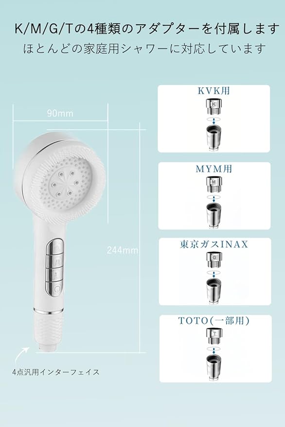 【国際汎用基準・工具不要で取付簡単】工具不要で簡単取付。国際汎用基準G1/2インターフェース対応で、ほとんどのシャワーホースに装着可能。さらに、付属の4種類のアダプターで幅広いメーカーに対応します。