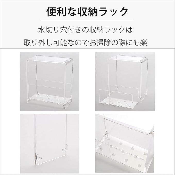 収納ラックに水切り穴が設けており、シャンプー・ボディーソープなどいろいろなバス用品が収納可能。ラックは取り外し可能なので、お掃除の際にも楽です。