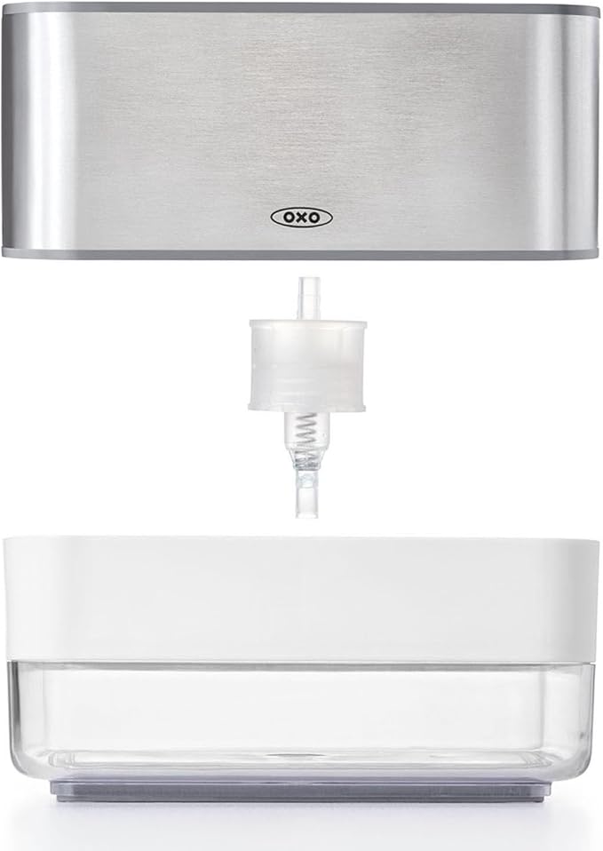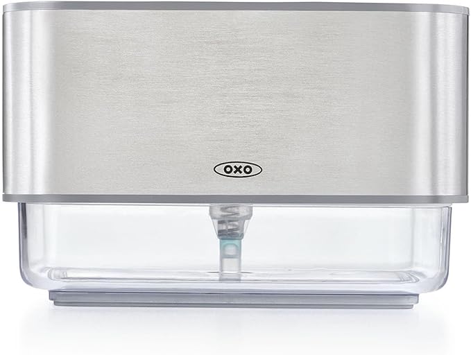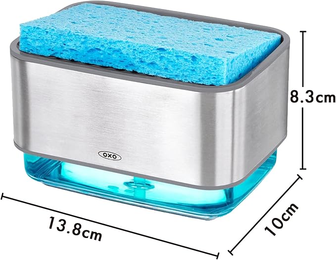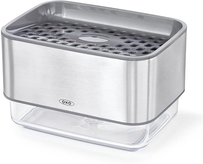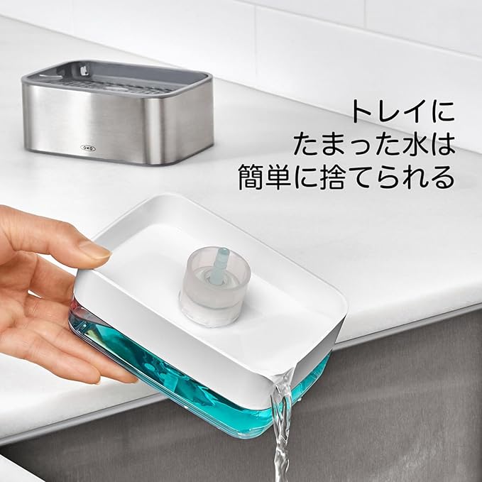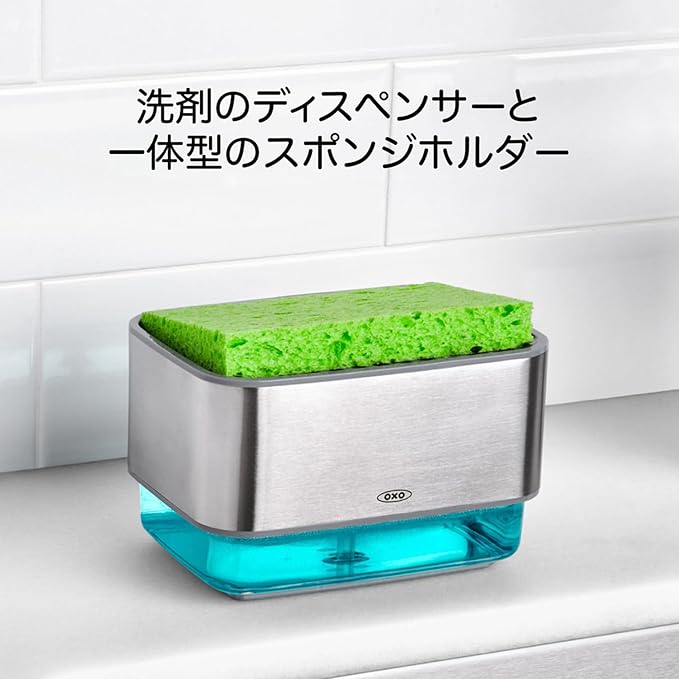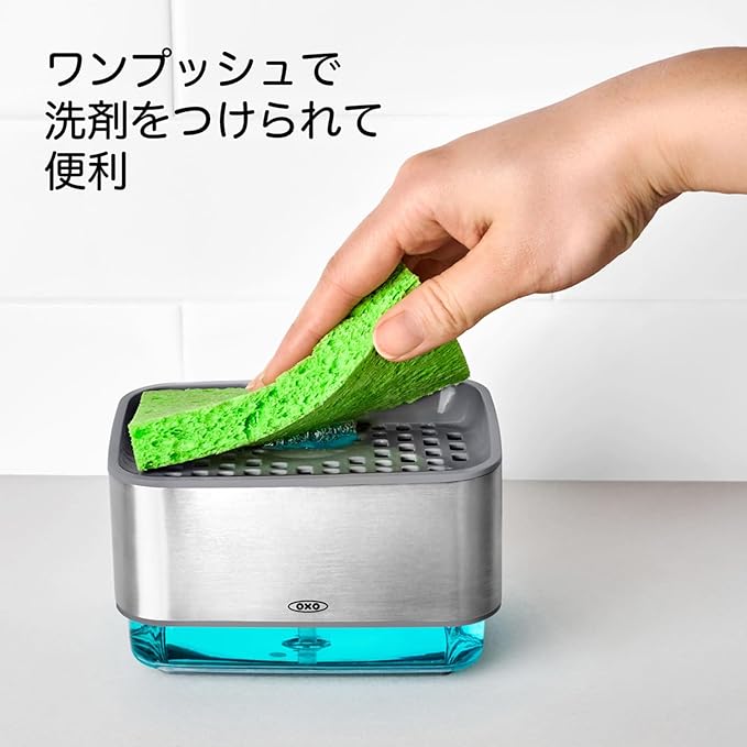 上部は水切りトレイが付いたホルダー(スポンジ置き)、下部はプッシュ式のディスペンサー(洗剤入れ)で、スポンジを乗せて上からプッシュするだけで洗剤がつけられる