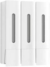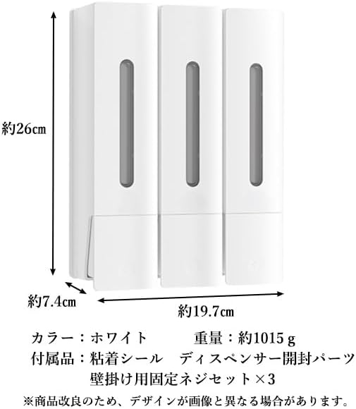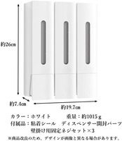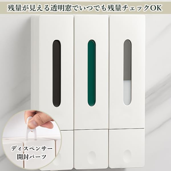 3連ディスペンサー:家族で使える!3種類の液体をすっきり分けて収納。壁掛け簡単設置:粘着シール付きで、工具不要&穴あけ不要。