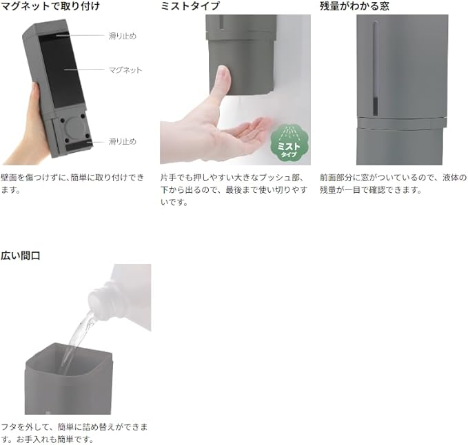 リッチェル(Richell) ホバー マグネットミストディスペンサー 500 ホワイト 1個 110052 ディスペンサー 押しやすい 片手 詰め替え プッシュ ミスト 貼れる 下から出る 浮かせる 収納 おしゃれ プラスチック サイズ/6.6 8 22H(cm) 容量/500mL 材質/ポリプロピレン他 耐荷重/1kg | KAZESHOP