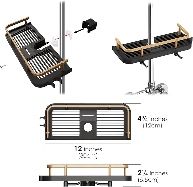 シャワーキャディシェルフの寸法: 30cm x 12cm x 5.5cm (注: 直径 22mm、24mm、25mm の丸いシャワーカラムチューブにのみ適しています)