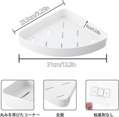 【取り付け簡単】まず設置場所を決め、棚が壁の角に合うかどうかテストします。壁をきれいにし、平らで乾燥した状態にします。棚を粘着フックにカチッとはめて壁に貼り付けます。棚を取り外し、押して粘着剤内の空気を抜きます。棚を再び粘着フックにカチッとはめて、使用前に24時間放置します。