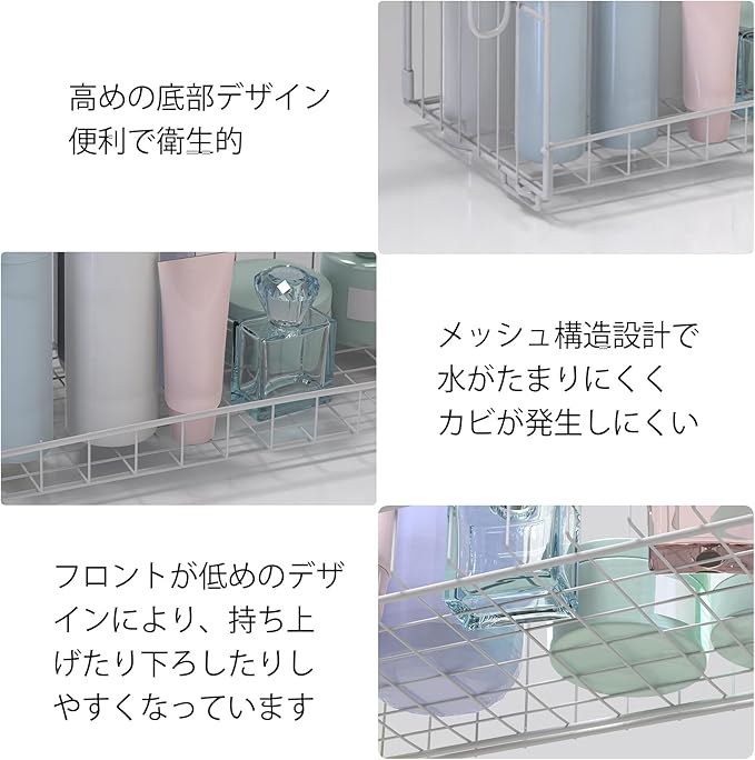 【多機能設計】バスルームラックの前部が低いので、棚に掛けても取り出しやすいです。タオルバーとフックも付属しており、追加の吊り下げや配置のオプションを提供します。タオル、シャワーカバー、スポンジなどを掛けてお部屋を整理でき、毎日の使用に便利です。