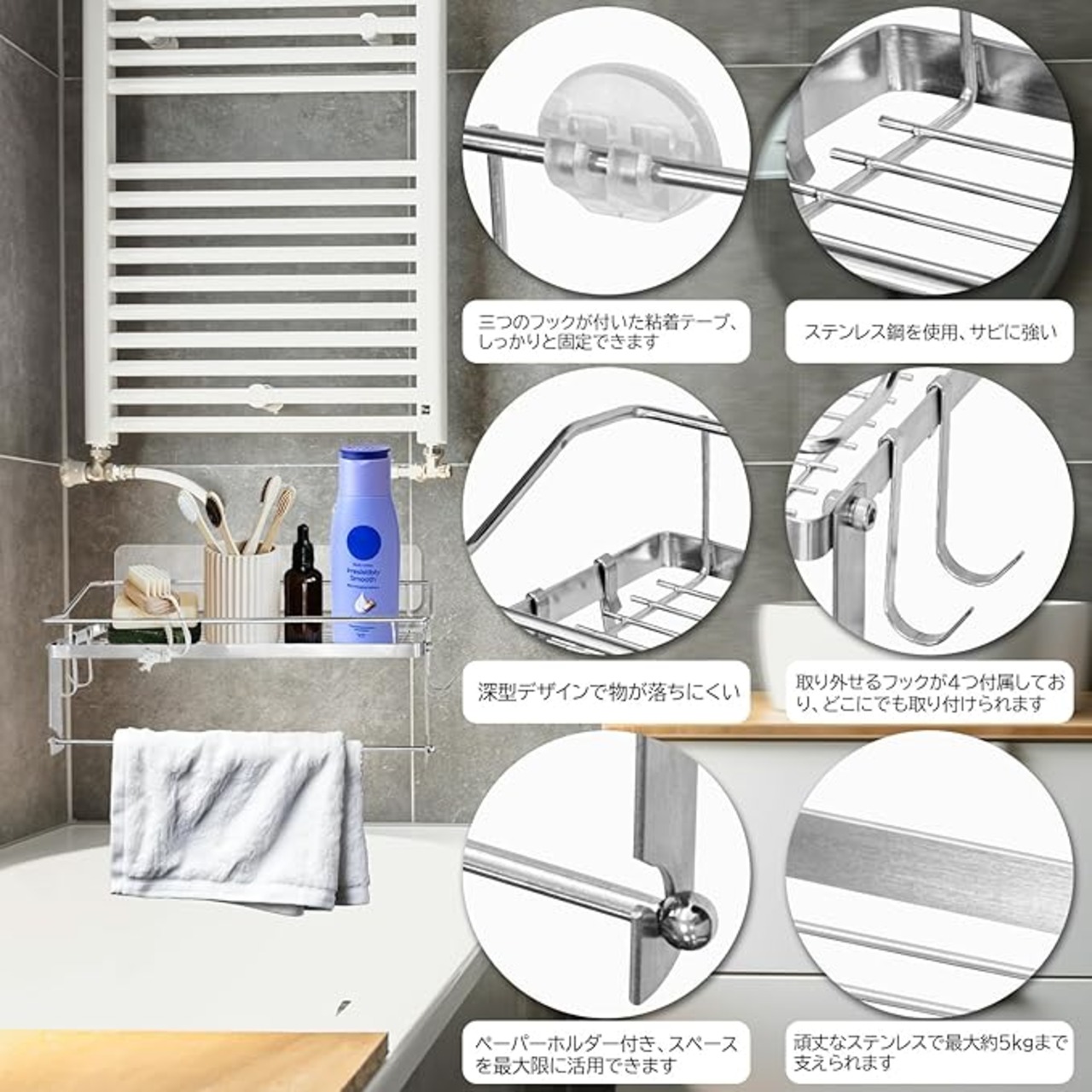 【サビに強いステンレス素材】このラック全体にはステンレス素材を使用、サビに非常に強く、長期間使用しても美しさを保てます。お風呂場、洗面所、キッチンなどは湿気が多く、サビが発生しやすい場所に最適。お手入れも簡単で、軽く拭くだけで清潔感をキープできます。手間いらずで便利、そして長持ちします。頑丈なステンレスで最大約5kgまで支えられる設計、家族全員分のバス用品を収納可能。