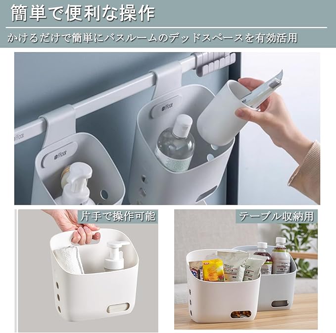 【スペースを節約】引っ掛けて使用できるバスケット。連結してのご使用も可能です。タオルバー、浴室扉のハンドルになどに引っ掛けたり、限られたスペースを有効活用できます。