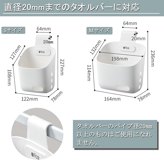 【仕様】Sサイズ:15*8*23㎝ Mサイズ;20*8*24㎝ ご注意:直径約1.8cm以内のタオルバーなどに取り付けます。