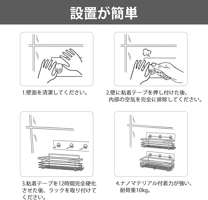 【簡単に取り付け可能】 この浴室ラックは、工具なしで取り付けができるため、誰でも簡単に設置できます。強力な粘着テープを壁に貼り付けるだけで、しっかりと固定されます。取り付け作業が簡単で、時間もかからず、手軽に浴室の収納スペースを増やすことができます。設置後もしっかりと耐荷重を持つため、安心して使用できます。