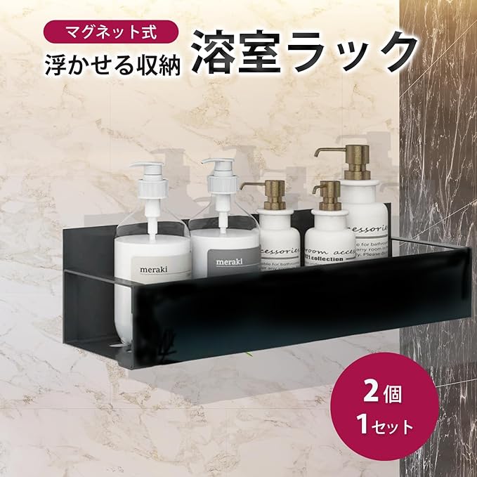 【マグネット式浴室ラック 2個セット】 キッチンや浴室で便利に使える、マグネット式のラックです。 シンプルなブラックカラーがどんなインテリアにも調和し、使い勝手も抜群です。
