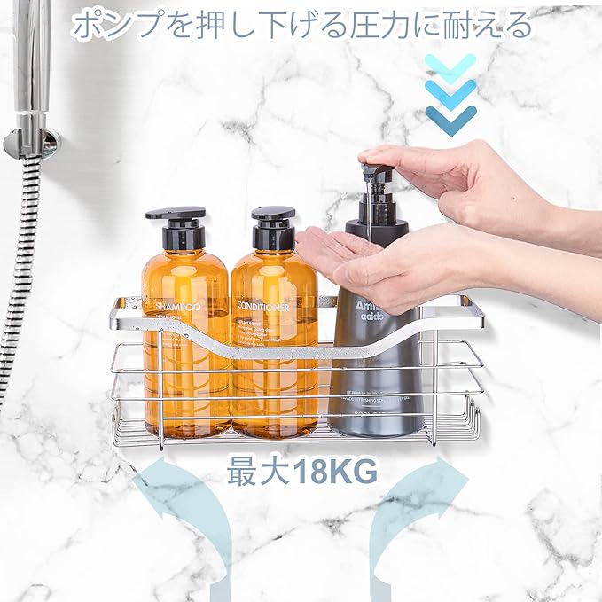 【穴開け要らない】取り付けは穴あけ不要で、付属の強力両面粘着剤を使用すれば簡単に設置でき、壁を傷つけません。必要に応じてネジを使った固定も可能なプレドリルデザインで、柔軟な設置方法を選べます。粘着剤は18kgまでの重量を支え、大型のボディソープも安心して置けます