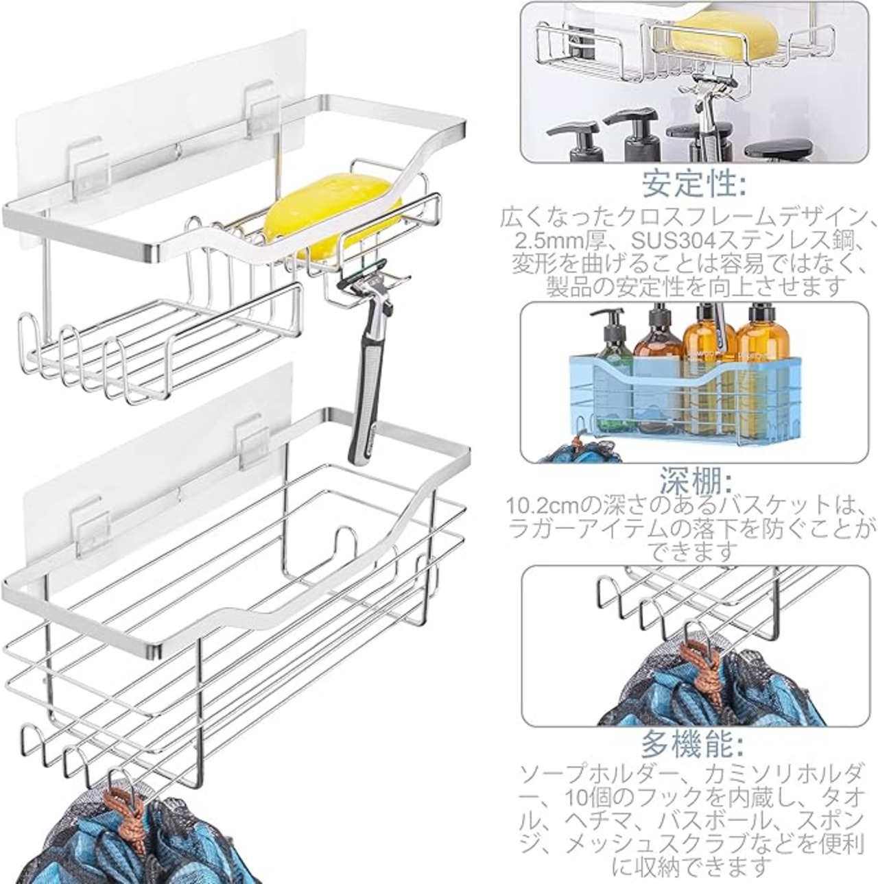 【多機能性】このお風呂場収納ラックは、2つのラックを組み合わせる多機能デザインで、浴室や洗面所の収納スペースを大幅に拡張します。左右に3つずつ付いたフックにより、タオルやヘチマ、バススポンジなど様々な小物を掛けられ、すっきりとした空間を実現します。深さ10cmのバスケットは背の高いシャンプーボトルも安定して置け、倒れる心配がありません