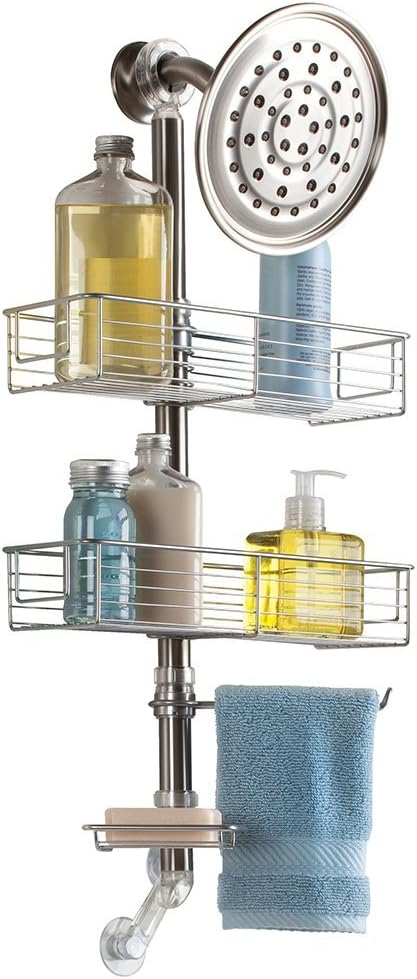 調節可能な収納バスケット2つと石鹸置き、タオルバー付き。バスケットを上下に調節して背の高いボトルも収納可能。