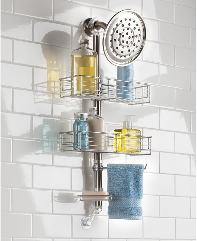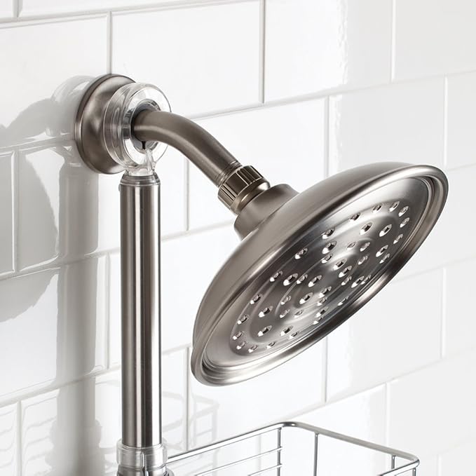 InterDesign フォーマ(Forma)シャワーキャディーは、調節可能な収納バスケット2つと石鹸置き、タオルバー付きで、モダンなマットフィニッシュのデザインです。金具なしで設置可能。シャワーヘッドに掛けて、タイルの目地に当たらないようにした部分の吸盤カップで固定するだけで、簡単に設置できます。