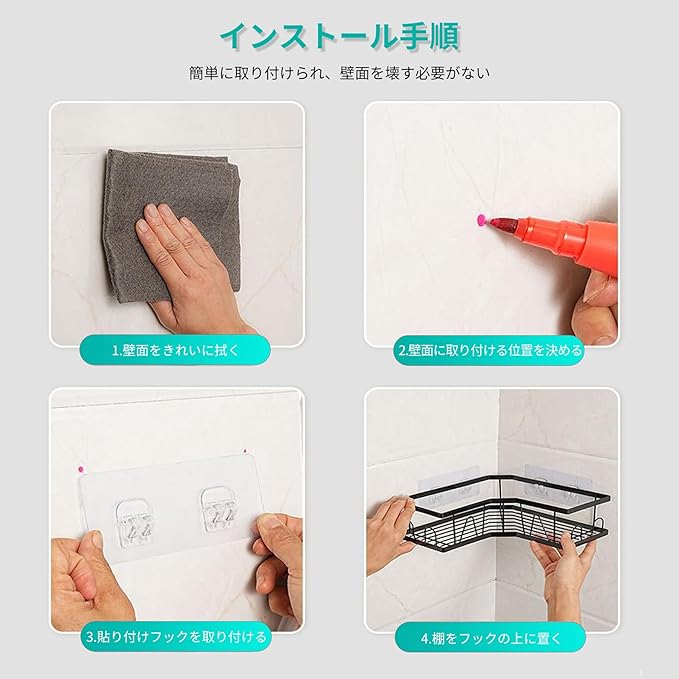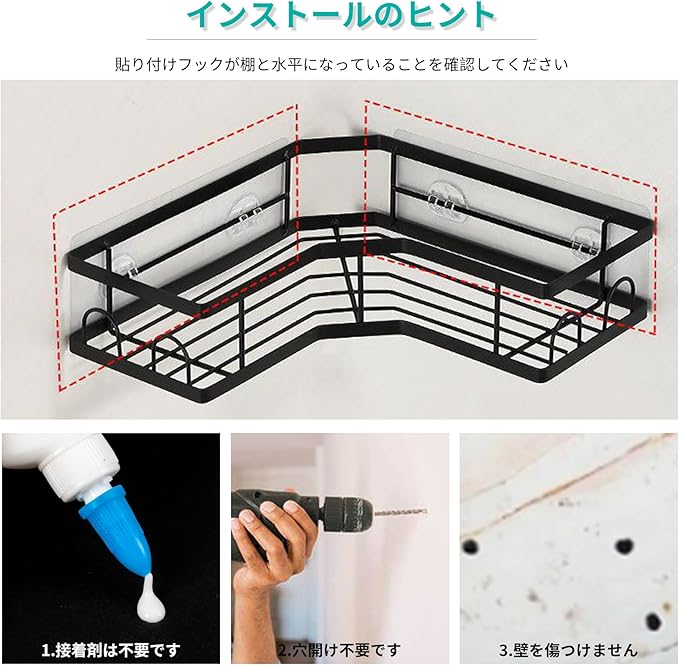 この製品は接着テープを使用して壁に取り付けます。正しく取り付けないと、製品が壁から剥がれ落ちたり、怪我や物損が起きる可能性があります。取り付け時は慎重に行ってください。また、製品の重量容量を超える荷物を載せないでください。