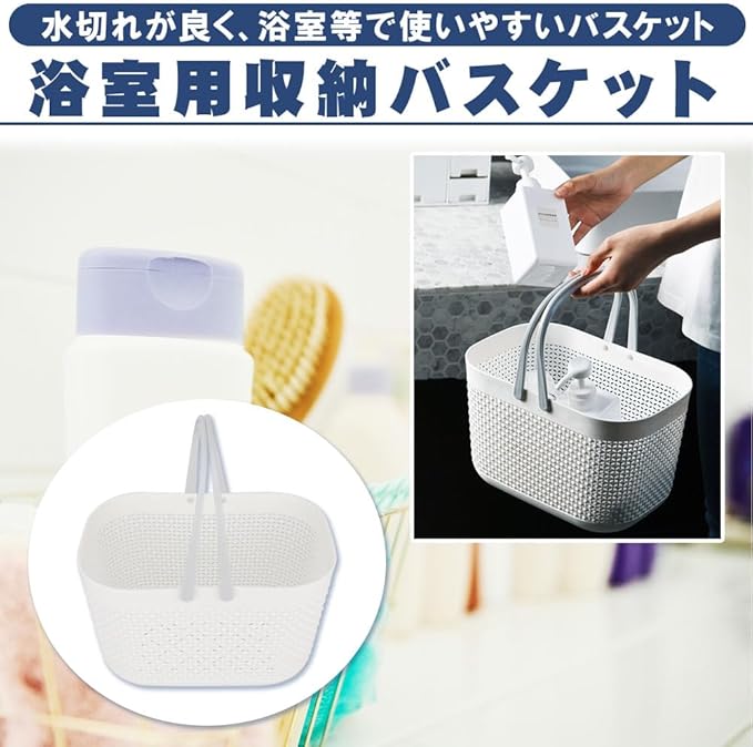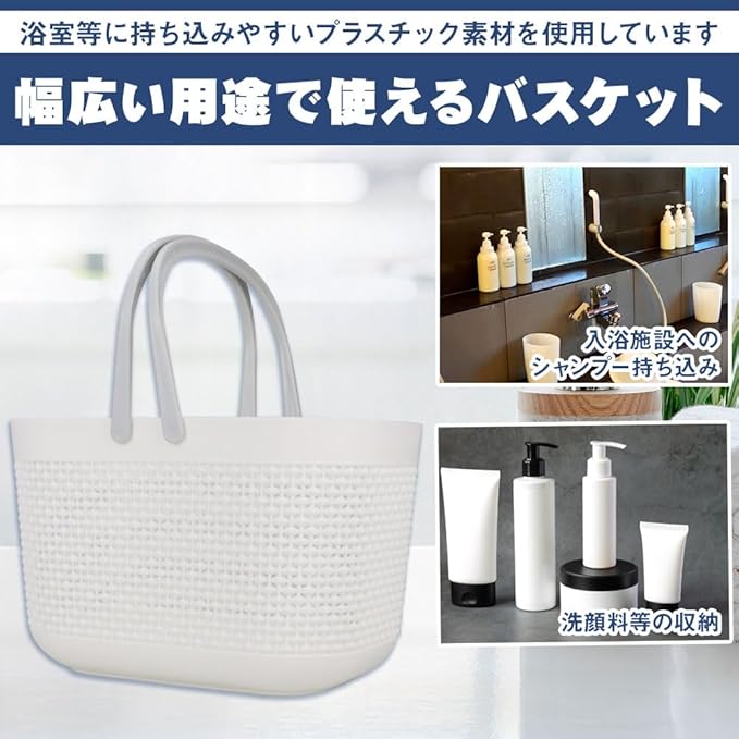 入浴時に必要な洗面用具やタオルなどの持ち運びに便利なバスケットです。シャンプーやリンスなどの重いボトルを入れても壊れにくい耐久性に優れたプラスチックを採用しています。